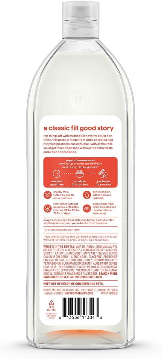 POWERED BY ENZYMES: Removes up to 99% of grease, with 50% less scrubs and 25% more suds* (*vs. original method dish soap)